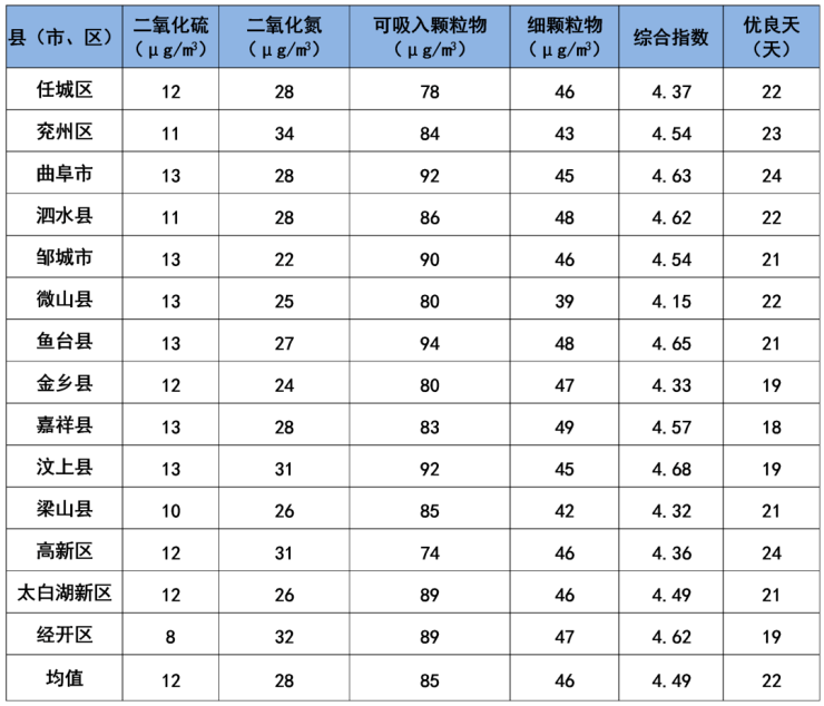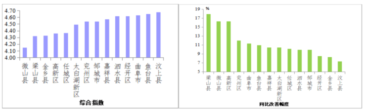 环境空气质量综合指数较好的县(市、区)是微山县,为4.15;最差的是汶上县,为4.68;14县(市、区)同比改善幅度较大的是梁山县,改善幅度为17.9%,最小的是汶上县,改善幅度为7.3%。