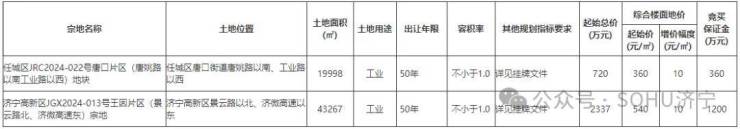 从2宗地块的具体分布上看,任城区1宗、济宁高新区1宗。从土地用途来看,均为工业用地。土地总面积为63265㎡,约95亩;总起始价为3057万元。