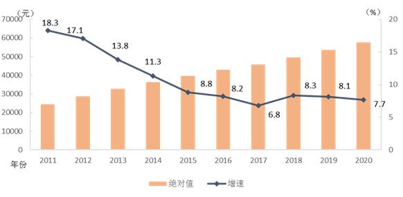 2020年城镇私营单位就业人员年平均工资57727元