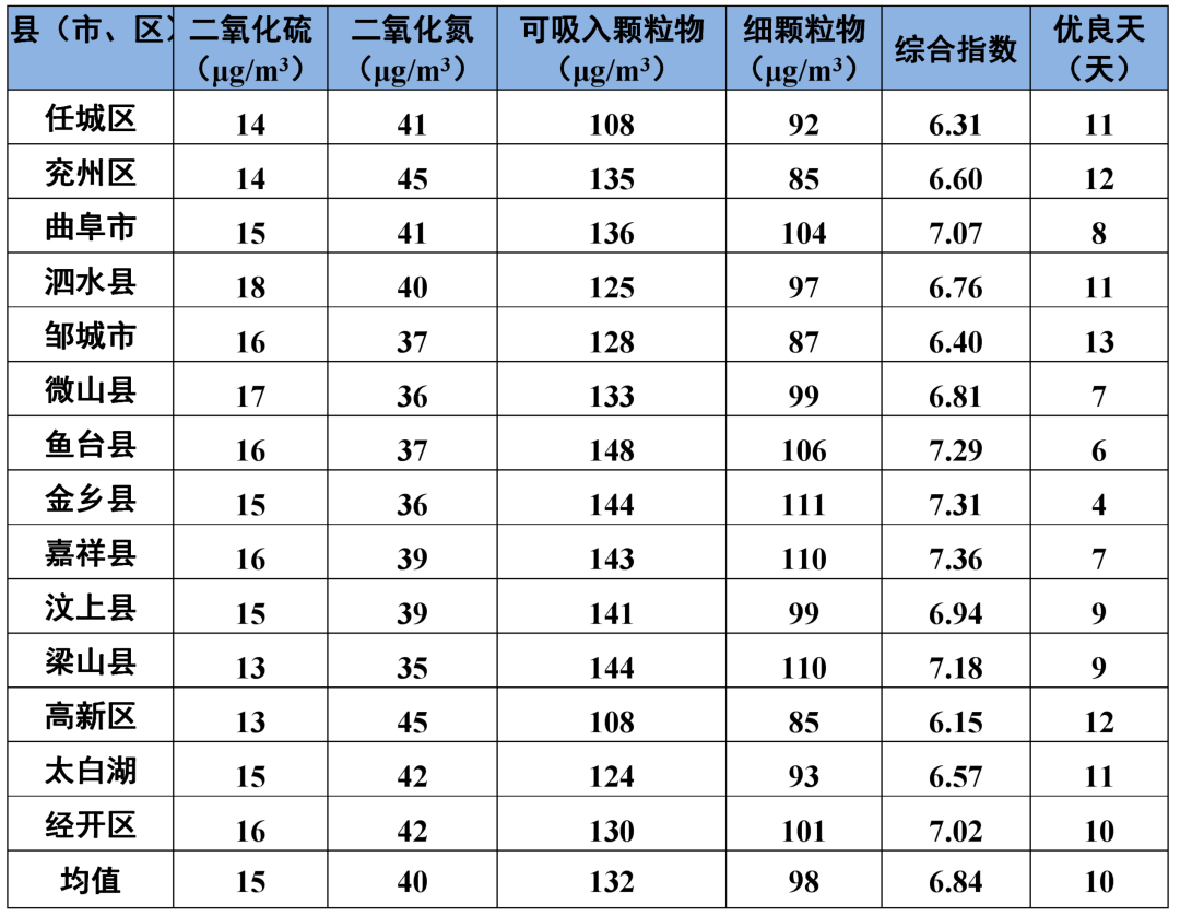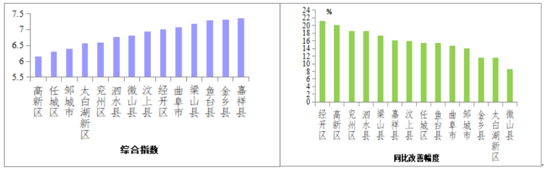 环境空气质量综合指数较好的县(市、区)是高新区,为6.15;最差的是嘉祥县,为7.36;14县(市、区)同比改善幅度较大的是经开区,改善幅度为21.2%,最小的是微山县,改善幅度为8.6%。