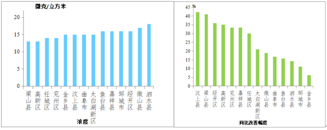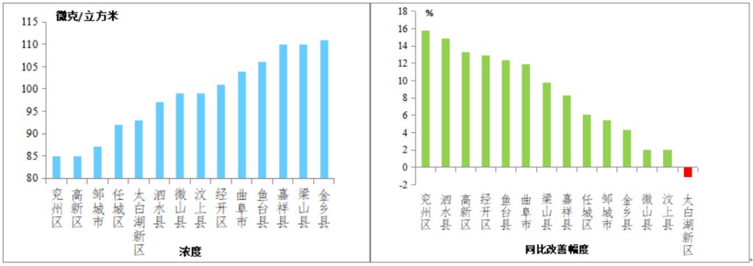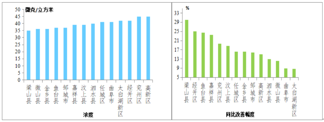 二氧化氮(NO2)浓度较低的县(市、区)是梁山县,为35微克/立方米;较高的是兖州区和高新区,均为45微克/立方米;14县(市、区)同比改善幅度较大的是梁山县,改善幅度为30.0%,最小的是太白湖新区,改善幅度为8.7%。