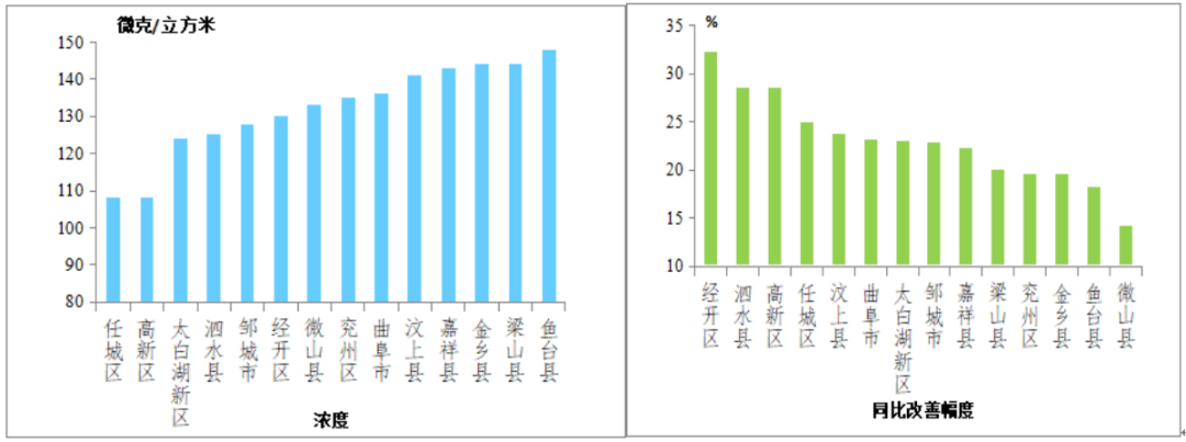 可吸入颗粒物(PM10)浓度较低的县(市、区)是任城区和高新区,均为108微克/立方米;较高的是鱼台县,为148微克/立方米;14县(市、区)同比改善幅度较大的是经开区,改善幅度为32.3%;最小的是微山县,改善幅度为14.2%。