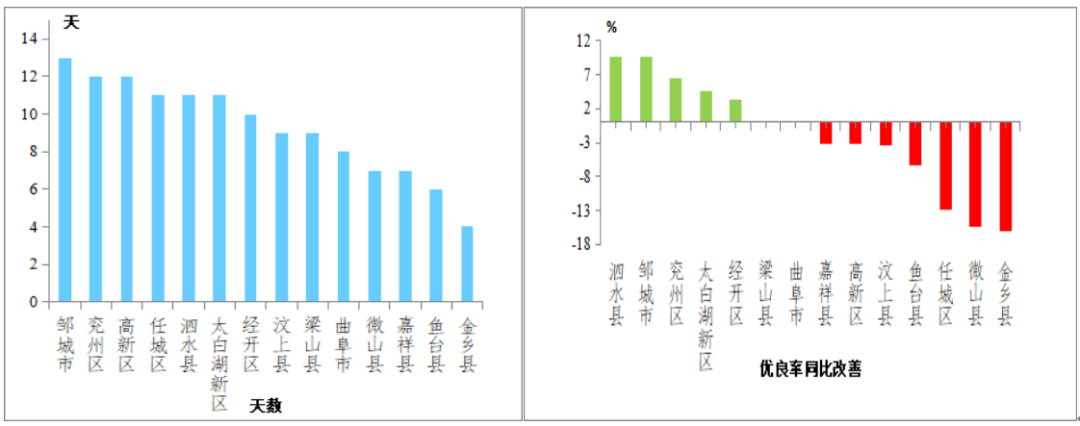 优良天最多的县(市、区)是邹城市,为13天;最少的金乡县,为4天;14县(市、区)优良率同比改善幅度较大的是泗水县,为提高9.7个百分点,最小的是金乡县,为减少16.1个百分点。
