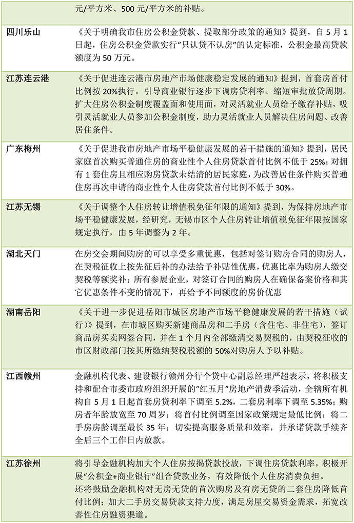湖南省岳阳市人民政府办公室则于5月1日印发《关于进一步促进岳阳市城区房地产市场平稳健康发展的若干措施(试行)》的通知,其中提到在市城区购买新建商品房和二手房(含住宅、非住宅),签订商品房买卖网签合同,并在1个月内全部缴清交易契税的,由契税征收的市区财政部门按其所缴纳契税税额的50%对购房人予以补贴。另外,对在市城区购买首套新建商品住房和二手住房,签订网签合同并完成契税缴纳的,给予每套1万元的购房补贴。