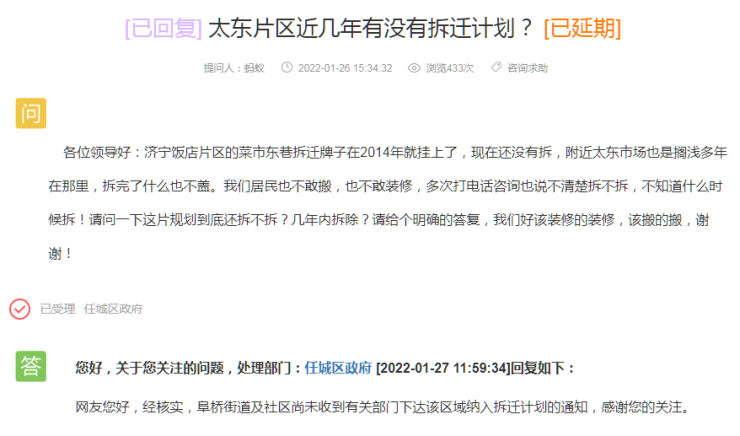 近日,搜狐网·搜狐焦点济宁小编在济宁市网络问政平台上注意到有网友提问:济宁饭店片区的菜市东巷拆迁牌子在2014年就挂上了,现在还没有拆,附近太东市场也是搁浅多年在那里,拆完了什么也不盖。我们居民也不敢搬,也不敢装修,多次打电话咨询也说不清楚拆不拆,不知道什么时候拆!请问一下这片规划到底还拆不拆?几年