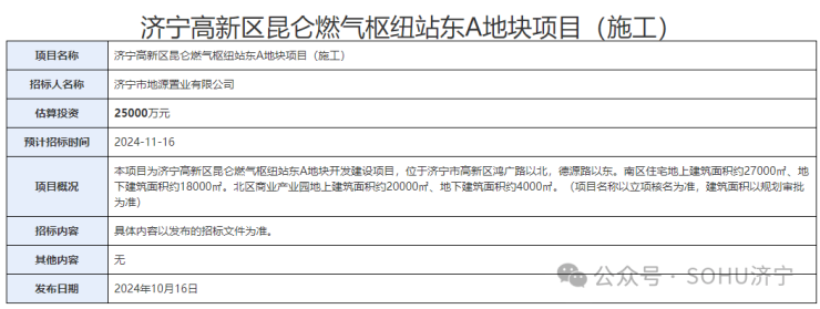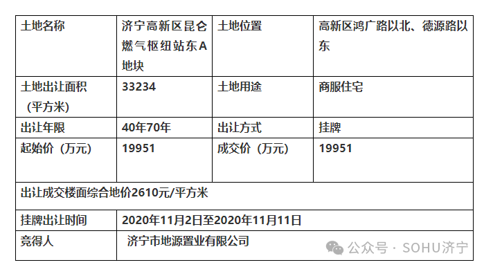 地块名:济宁高新区昆仑燃气枢纽站东A地块【济宁市地源置业有限公司拍得】