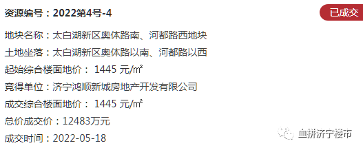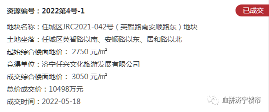 土地位于:任城区英智路以南、安顺路以东、居和路以北;土地面积:15646㎡(约23.5亩);土地用途:商住用地;出让年限:商业40年、住宅70年;容积率不大于2.2;起始价:9466万元,综合楼面价起价:2750元/㎡;最终成交价为:10498万元(约447万元/亩),综合楼面地价成交价:3050元/㎡;溢价率:10.90%;