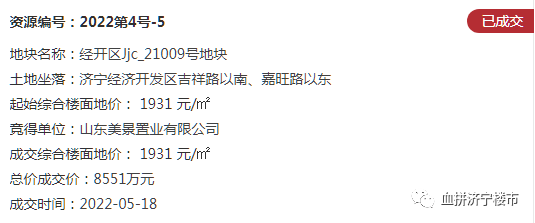 土地位于:济宁经济开发区吉祥路以南、嘉旺路以东;土地面积:21086㎡(约31.6亩);土地用途:住宅用地;出让年限:70年;容积率不大于2.1;起始价:8551万元,综合楼面价起价:1931元/㎡;最终成交价为:8551万元(约271万元/亩),综合楼面地价成交价:1931元/㎡;溢价率:0.0%;