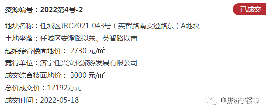 土地位于:任城区安澄路以东、英智路以南;土地面积:18472㎡(约27.7亩);土地用途:商住用地;出让年限:商业40年、住宅70年;容积率不大于2.2;起始价:11095万元,综合楼面价起价:2730元/㎡;最终成交价为:12192万元(约440万元/亩),综合楼面地价成交价:3000元/㎡;溢价率:9.89%;