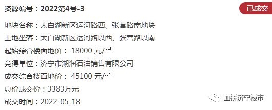 土地位于:太白湖新区运河路以西、张营路以南;土地面积:1500㎡(约2.3亩);土地用途:商服(加油加气站)用地;出让年限:40年;容积率不大于0.5;起始价:1350万元,综合楼面价起价:18000元/㎡;最终成交价为:3383万元(约1504万元/亩),综合楼面地价成交价:45100元/㎡;溢价率:150.59%;
