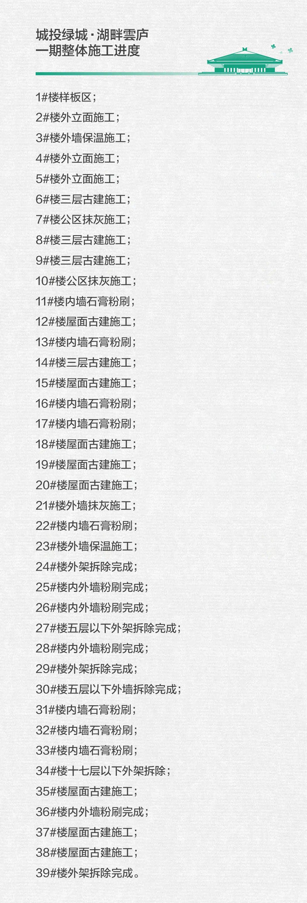 一砖一瓦,一木一石。那个无数次入梦的家,正渐渐从图纸中款款迈入现实。我们以时间鉴证品质的沉淀,城投绿城湖畔雲庐与您一起静候佳音,遇见美好家!