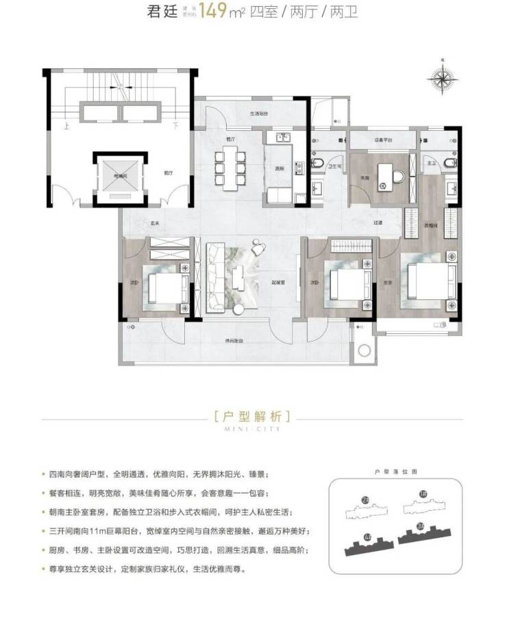 申创君汇洋房规划,最奢侈的手笔莫过于约25㎡南北双向阳台设计,约12.5㎡空间不计入建筑面积,高性价比,私藏非凡视界。南向三联阔阳台,给每个全龄段家庭成员一个诗意自在空间;北向生活阳台,给日常琐碎冗余更多空间,让生活井井有条。