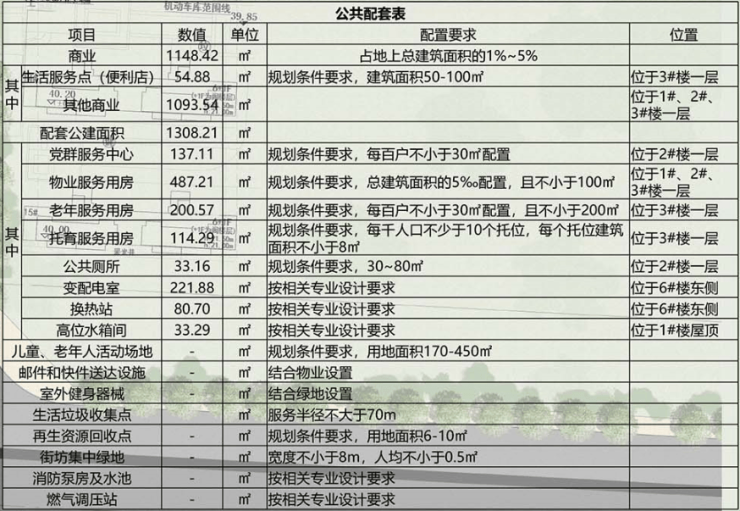项目规划建设用地面积34307㎡;总建筑面积:97301.68㎡;其中,计容建筑面积:61752.60㎡(含住宅建筑面积59295.97㎡、商业建筑面积1148.42㎡、社区配套用房建筑面积1308.2㎡),地下建筑面积35549.08㎡。容积率1.8;建筑密度27.95%;绿地率35.10%;计划总居住户(套)数为446户(套),居住人数约1427人(按3.2人/户预算);建筑类型包括住宅、商业、社区配套用房、公服配套设施等;规划机动车停车位588个,非机动车停车位562个。