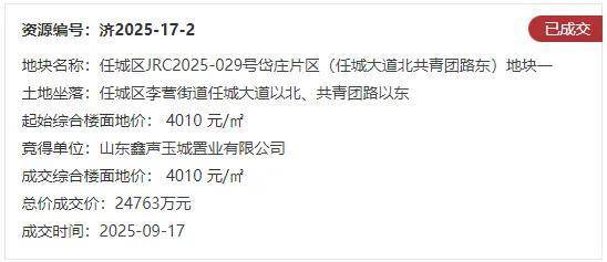 地块名:任城区JRC2025-029号岱庄片区(任城大道北共青团路东)地块一【山东鑫声玉城置业有限公司竞得】