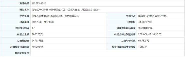 土地位于:任城区李营街道任城大道以北、共青团路以东;土地面积:34307㎡(约51亩);土地用途:商住用地;出让年限:40年;容积率不大于1.8;起始价:24763万元,综合楼面价起价:4010元/㎡;最终成交价为:24763万元(约486万元/亩),综合楼面地价成交价:4010元/㎡;溢价率:0.0%;