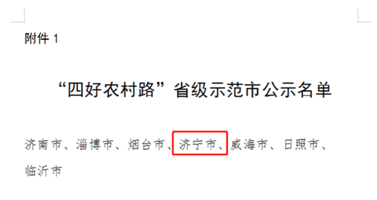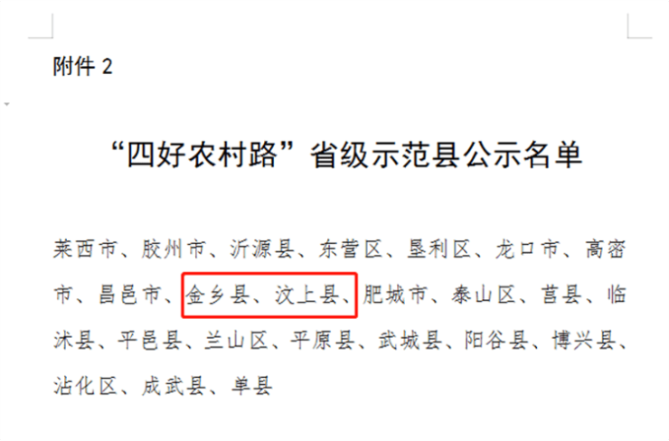 2月14日,山东省交通运输厅官网发布《关于2022年“四好农村路”省级示范创建结果的公示》,根据《“十四五”期省级“四好农村路”示范创建工作方案》和《关于组织开展2022年“四好农村路”省级示范市(县)暨“四好农村路”全国示范县创建工作的通知》要求,并经省功勋办备案通过,山东省交通运输厅联合省财政厅、农业农村厅、乡村振兴局组织开展了2022年“四好农村路”省级示范创建工作。其中,济宁市入选四好农村路”省级示范市,金乡县、汶上县入选“四好农村路”省级示范县,具体名单如下。