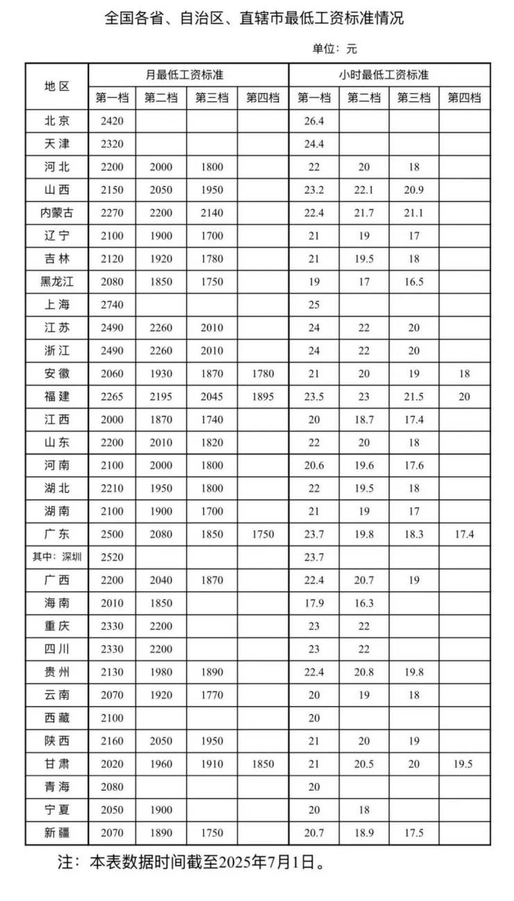 近日,人社部官网公布全国各省、自治区、直辖市最低工资标准情况(截至2025年7月1日)。