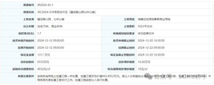 土地位于:济宁经济开发区吉祥路以北、嘉美路以西;土地面积:26769㎡(约40.2亩);土地用途:城镇住宅用地兼容商业用地;出让年限:住宅70年、商业40年;不大于1.8;起始价:7469万元,综合楼面价起价:1550元/㎡;最终成交价为:7469万元(约186万元/亩),综合楼面地价成交价:1500元/㎡;溢价率:0.0%;