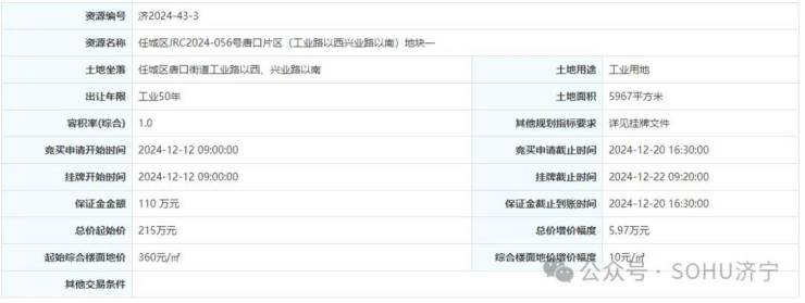 土地位于:任城区唐口街道工业路以西、兴业路以南;土地面积:5967㎡(约9亩);土地用途:工业用地;出让年限:工业50年;不小于1.0;起始价:215万元,综合楼面价起价:360元/㎡;最终成交价为:215万元(约24万元/亩),综合楼面地价成交价:360元/㎡;溢价率:0.0%;