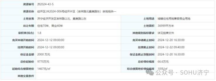 土地位于:济宁经济开发区吉祥路以北、嘉美路以东;土地面积:36999㎡(约55.5亩);土地用途:城镇住宅用地兼容商业用地;出让年限:住宅70年、商业40年;不大于1.8;起始价:9770万元,综合楼面价起价:1467元/㎡;最终成交价为:9770万元(约176万元/亩),综合楼面地价成交价:1467元/㎡;溢价率:0.0%;