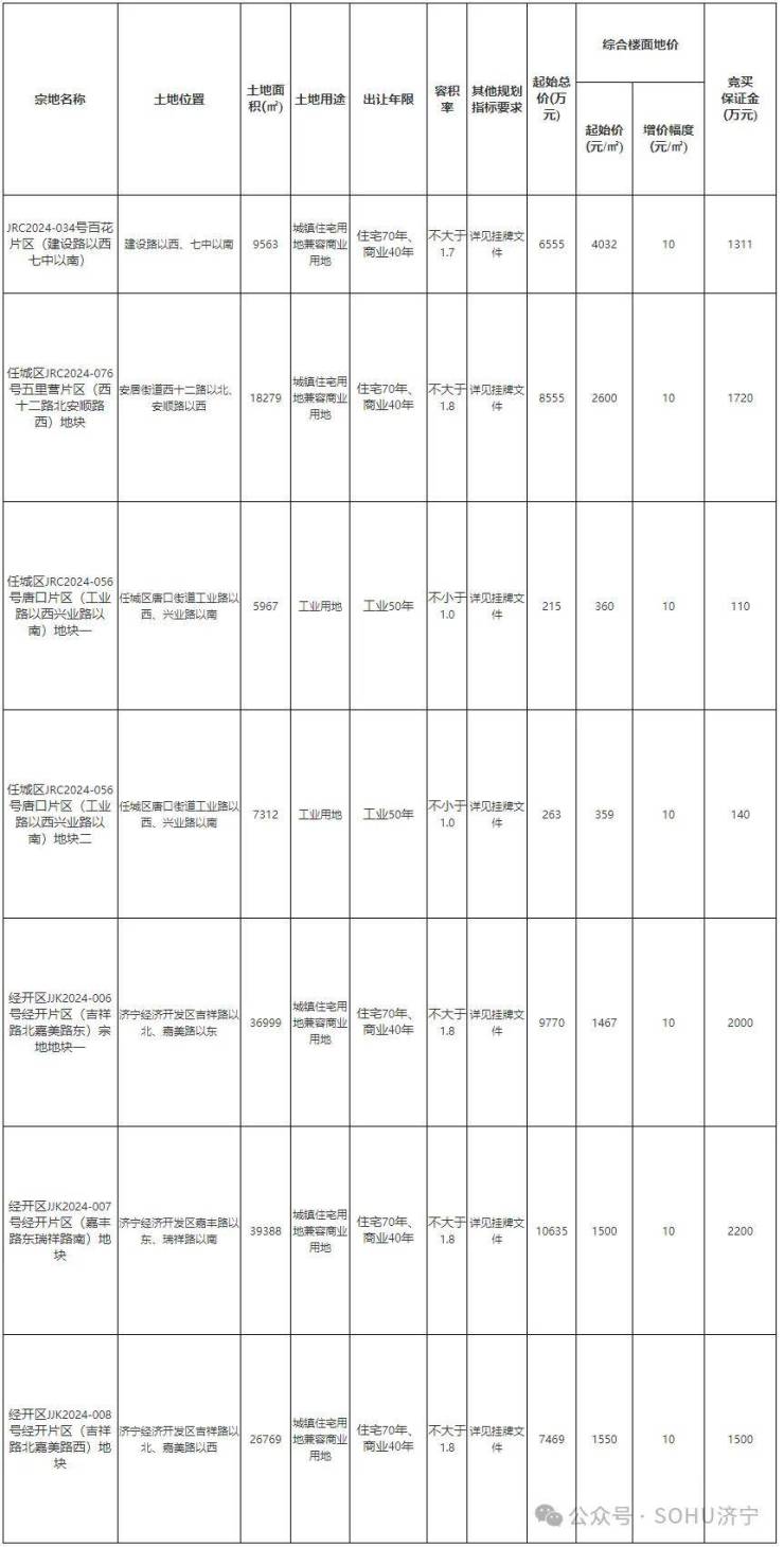 从7宗地块的具体分布上看,任城区4宗、济宁经开区3宗。从土地用途来看,5宗城镇住宅用地兼容商业用地、2宗工业用地。土地总面积为144277㎡,约216亩;总起始价为43462万元。