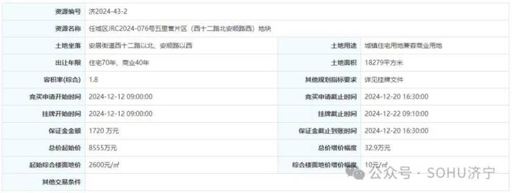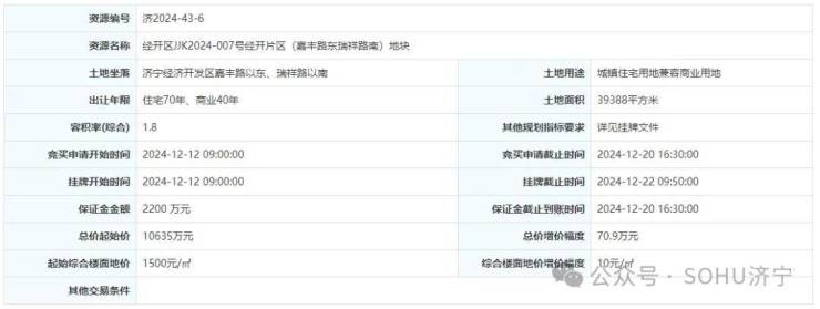 土地位于:济宁经济开发区嘉丰路以东、瑞祥路以南;土地面积:39388㎡(约59.1亩);土地用途:城镇住宅用地兼容商业用地;出让年限:住宅70年、商业40年;不大于1.8;起始价:10635万元,综合楼面价起价:1500元/㎡;最终成交价为:10635万元(约180万元/亩),综合楼面地价成交价:1500元/㎡;溢价率:0.0%;