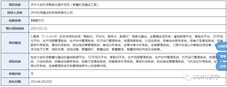 近日,搜狐网济宁小编注意到济宁大安机场智能化提升项目(智慧机场建设工程)开始招标,具体如下: