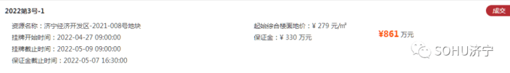 土地位于:济宁经济开发区嘉合路以东、嘉吉饲料公司以南;土地面积:23330㎡(约35亩);土地用途:工业用地;出让年限:50年;容积率不小于1.0;起始价:651万元,综合楼面价起价:279元/㎡;最终成交价为:861万元(约25万元/亩),综合楼面地价成交价:369元/㎡;溢价率:32.26%;