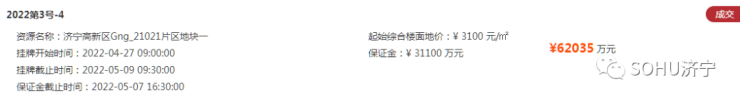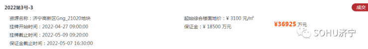 济宁城区挂地!搜狐网济宁小编从济宁市自然资源和规划局了解到:经济宁市人民政府批准,济宁市自然资源和规划局决定以网上挂牌方式出让济宁高新区、经开区共4宗国有建设土地使用权,土地用途为1宗工业用地、1宗商服(加油加气站)用地、2宗商住用地;土地面积188274㎡,约282亩;土地起始价为104411万元;经竞价后,地块全部成交,最终成交价为104621万元;