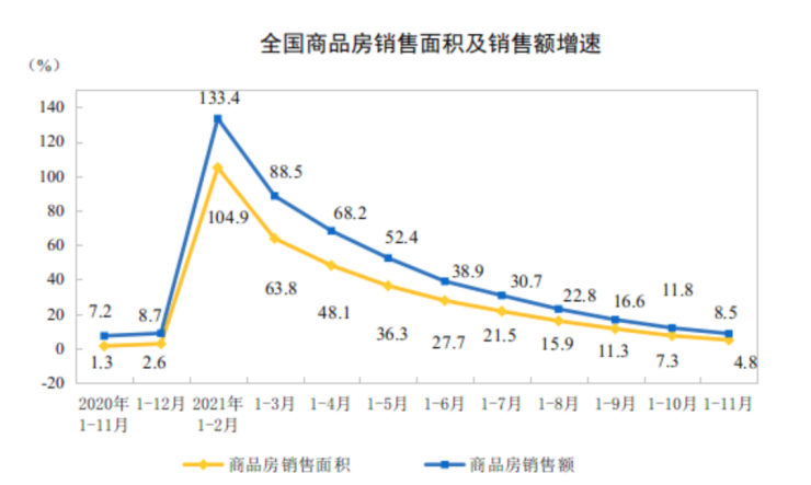 1—11月,全国商品房销售额161667亿元,增长8.5%;比2019年1—11月份增长16.3%,两年平均增长7.8%。其中,住宅销售额增长9.3%,办公楼销售额下降3.0%,商业营业用房销售额下降2.2%。