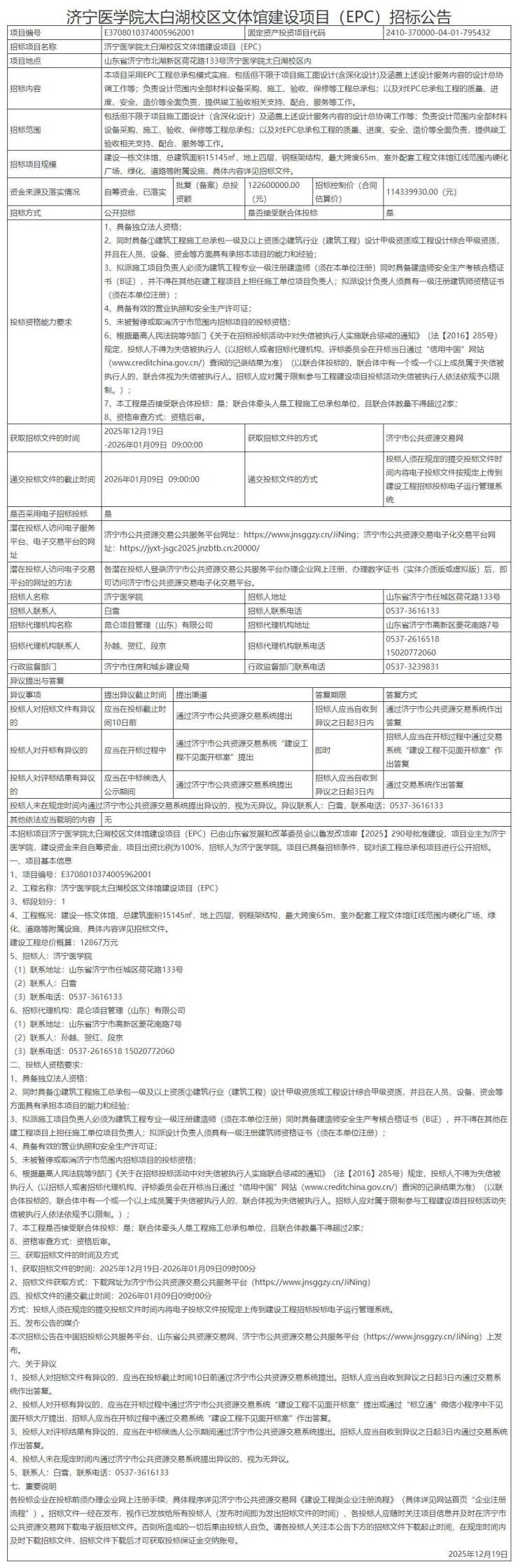2025年12月19日,济宁医学院太白湖校区文体馆建设项目(EPC)招标公告发布,项目地点位于山东省济宁市北湖新区荷花路133号济宁医学院太白湖校区内。批复(备案)总投资额约1.23亿元。